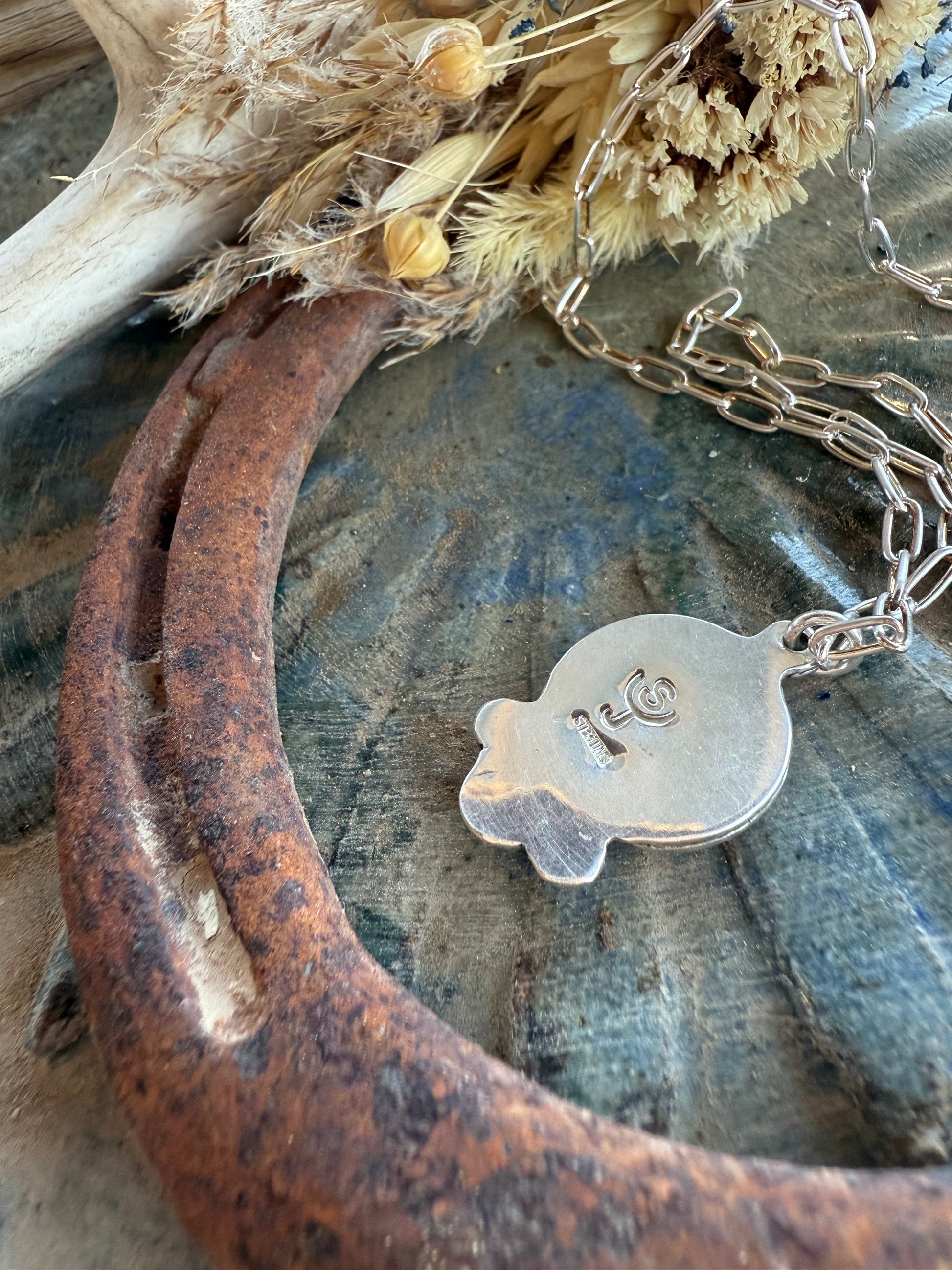 The focal of this piece is the rustic sand cast sterling silver horse head cameo accented with Kingman turquoise & sterling silver Rosetta’s. Necklace measures 18" & pendant measures approx. 1 1/4". It hangs from a sterling silver link chain and is finished with a lobster claw clasp.