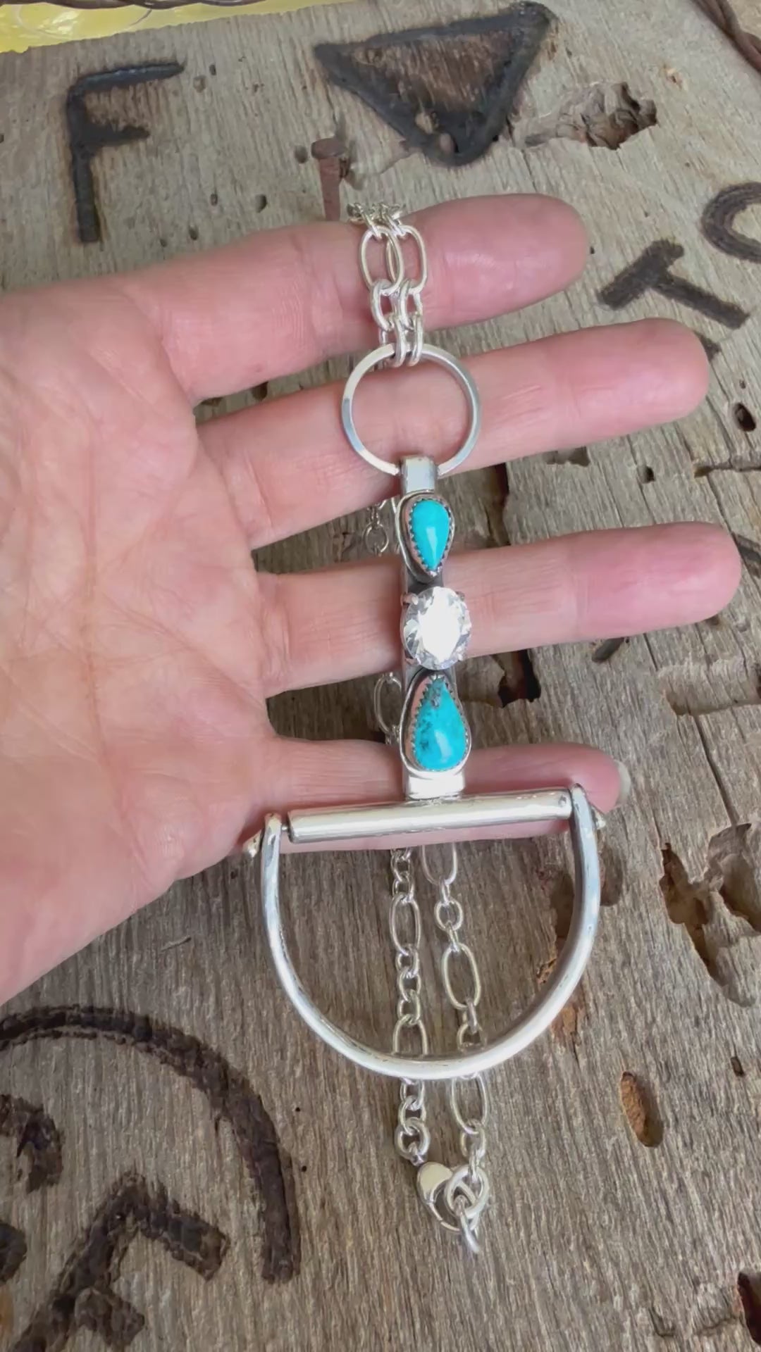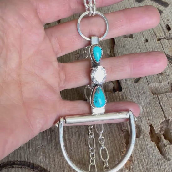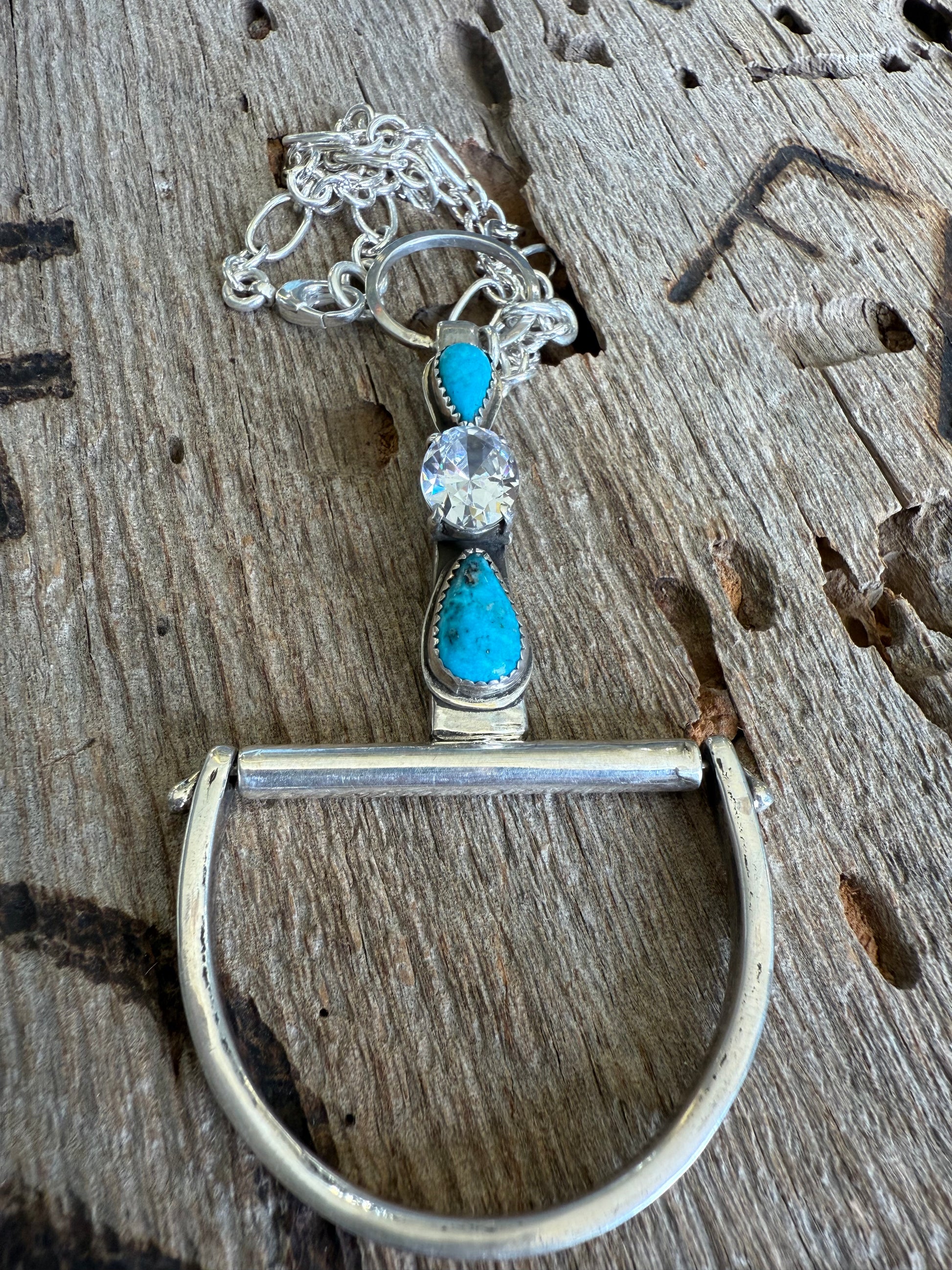 Made from solid sterling silver. The majority of this piece has been sand cast and shaped in to form of a snaffle bit and accented with a 8 ct of Sonoran turquoise set in a serrated bezel. In the center of the two stones is a faceted CZ stone set in a prong setting. The pendant measures 4 1/2" from the top of the bail to the bottom of the pendant by 2" at its widest point.