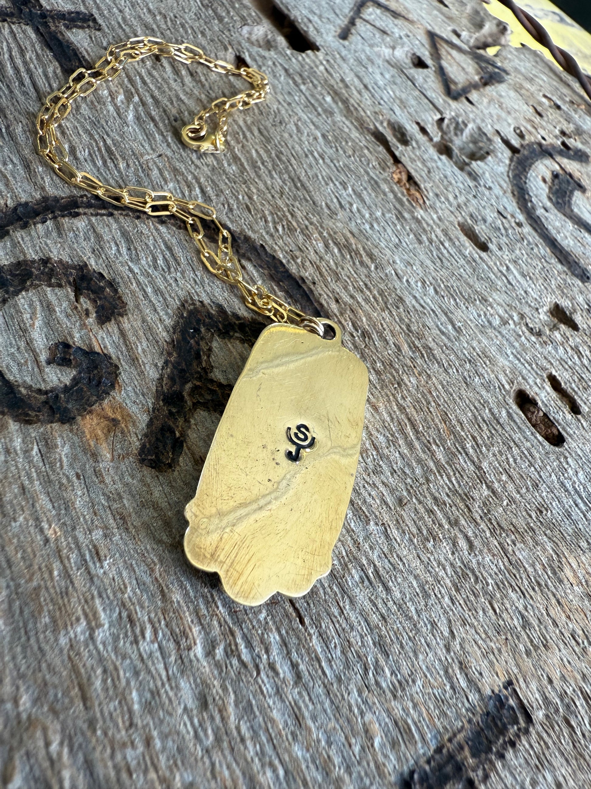 This pendant is made for an upcycled portion of a ceramic plate. I shaped the piece by hand and set it in a brass serrated bezel with tiny Kingman turquoise stone, brass rosettas and dot accents. Pendant measures 2" x 1" and hangs from a 16.5" Gold filled link chain with lobster claw clasp.