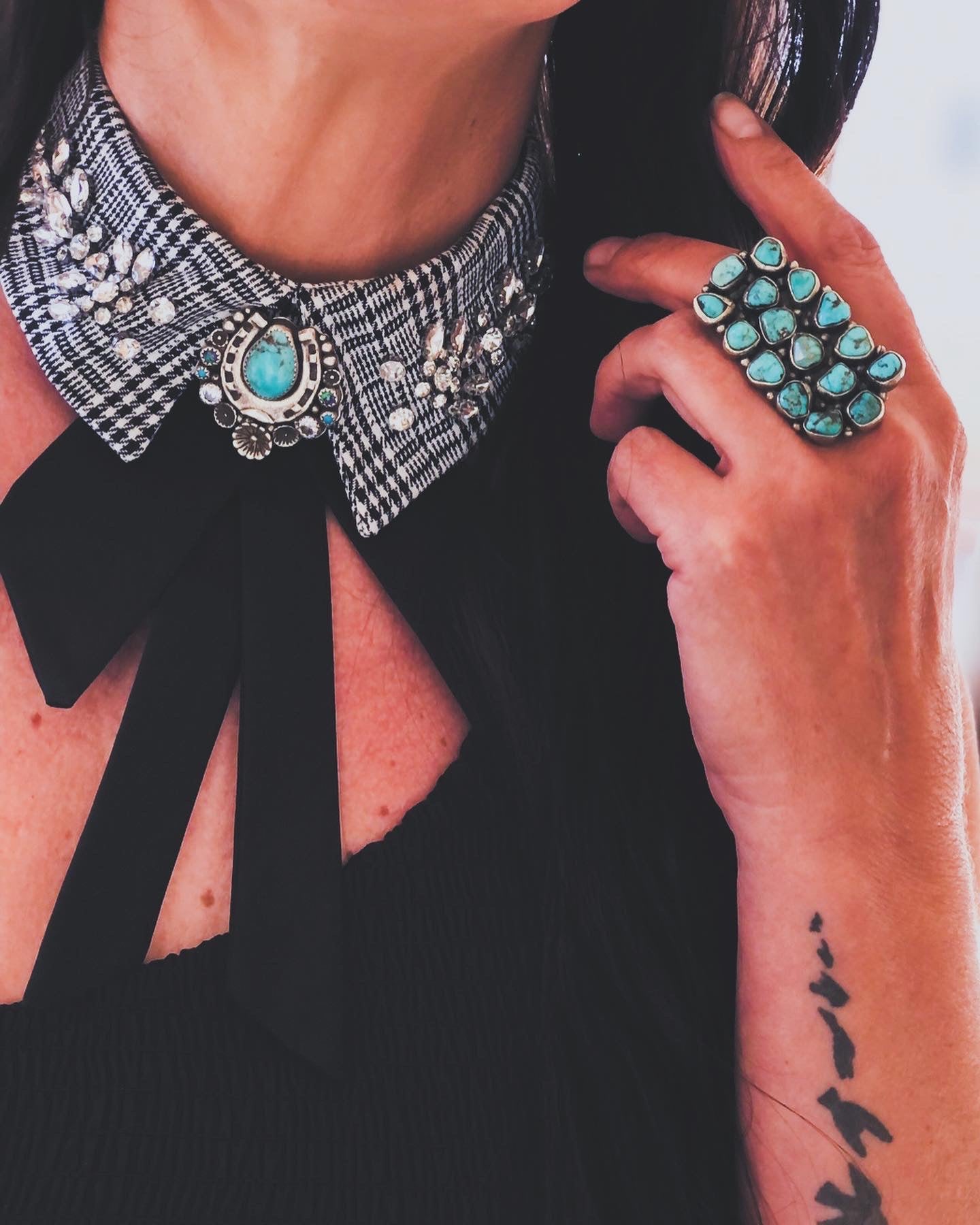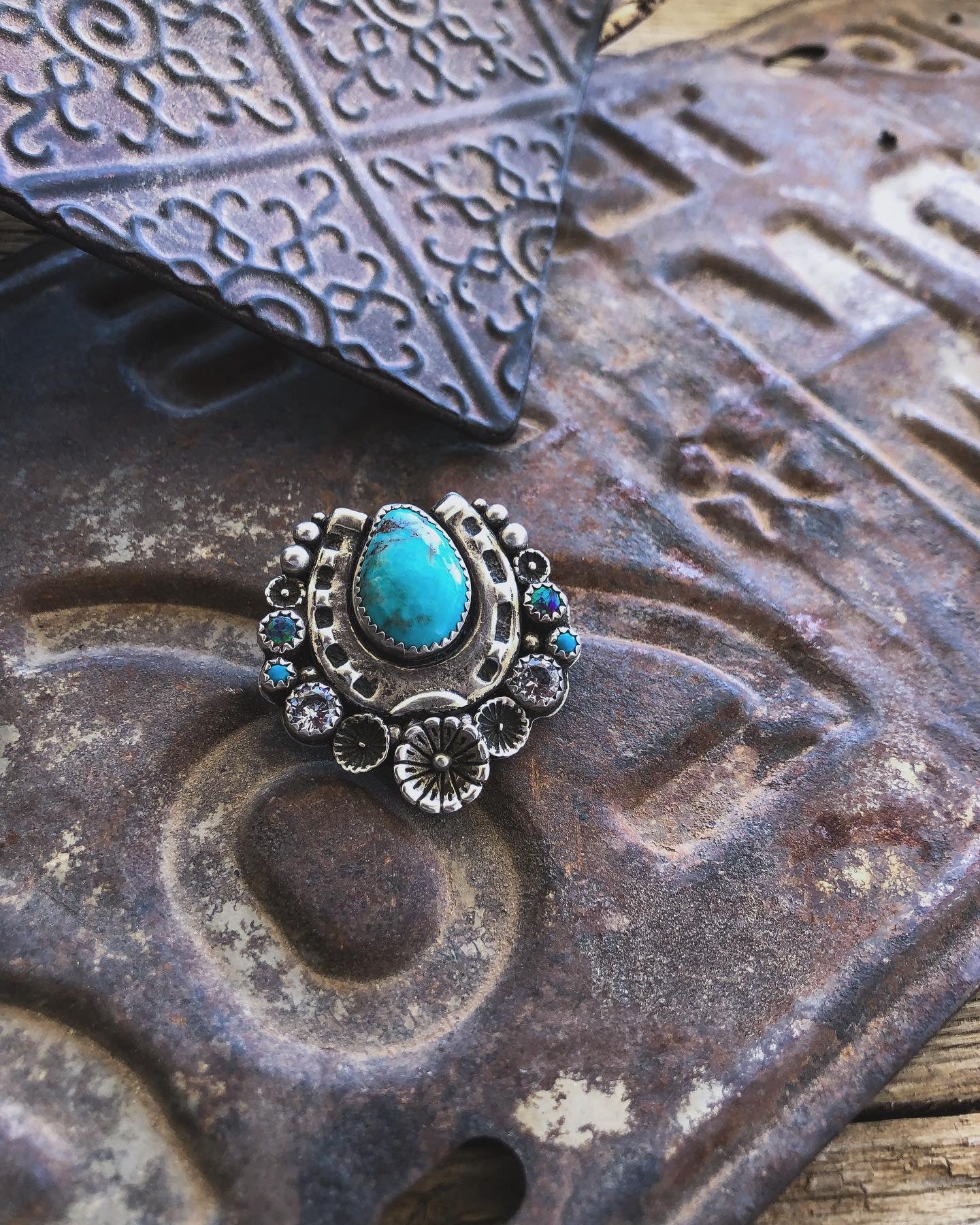 The focal of this amazing pin is the 10 ct Blue Ridge Turquoise cabochon. I've surrounded the stone with a hand-cast sterling silver horseshoe, desert flowers, opal, Sleeping Beauty turquoise, faceted crystal & dot accents.