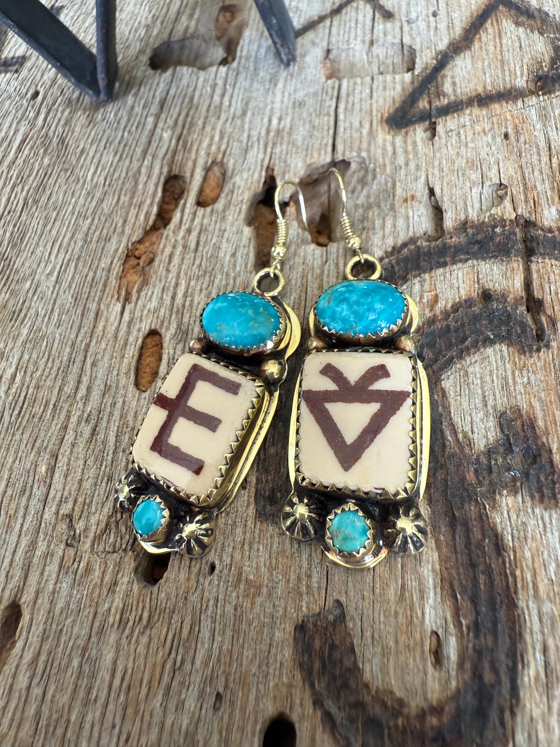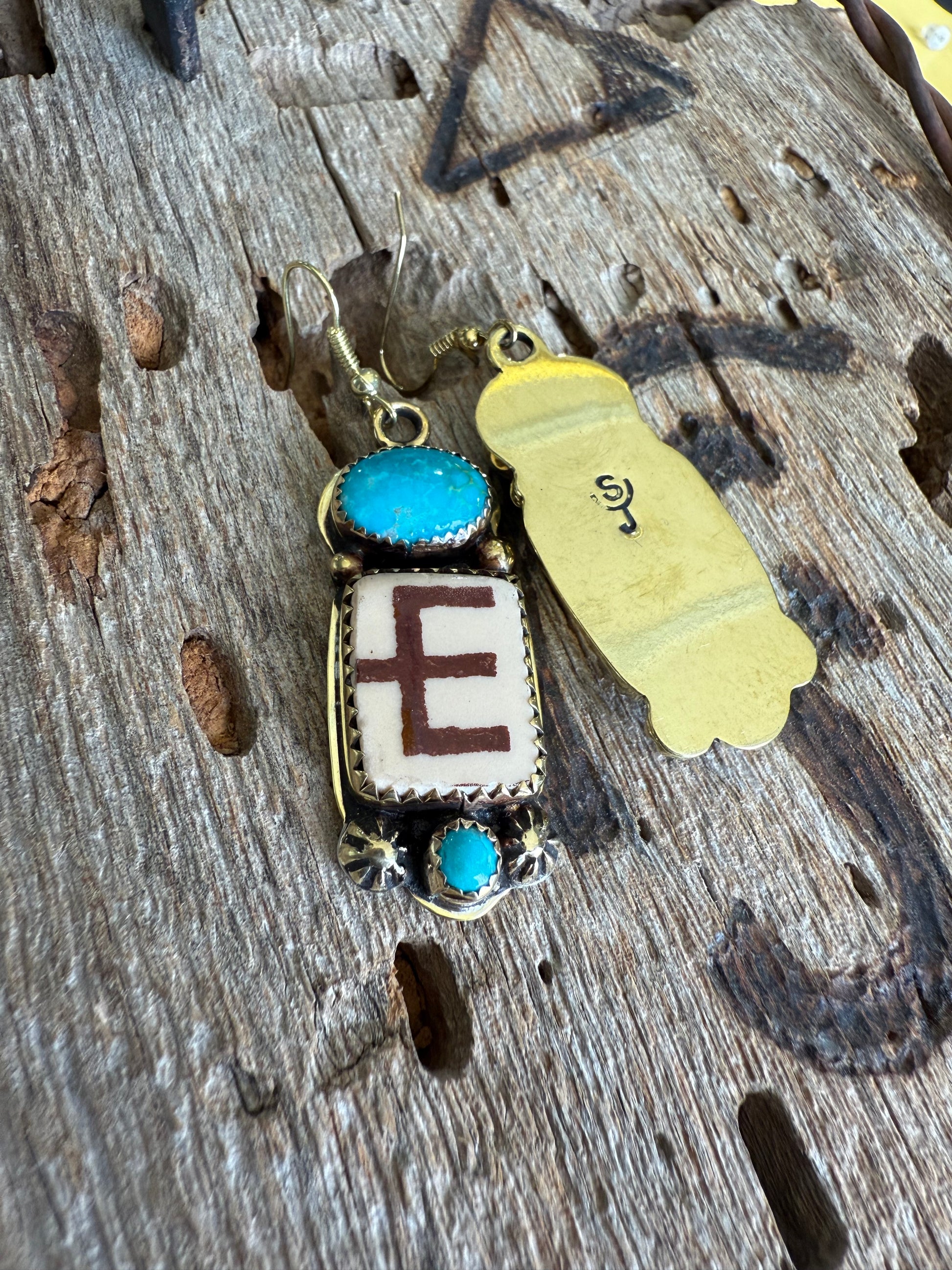 These earrings are made for an upcycled branding ceramic plate. I shaped the pieces by hand and set it in a solid brass serrated bezel with Kingman turquoise stones, sterling rosettas and dot accents. Earrings measures 2 1/2" x 3/4" and hangs from a brass ear wire.